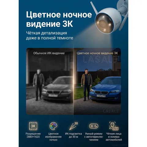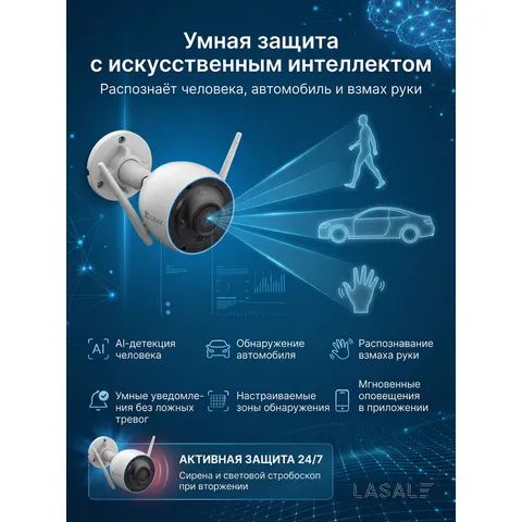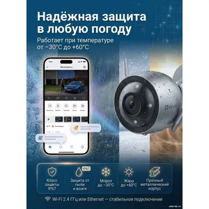 EZVIZ H3 — это мощная уличная Wi-Fi камера с разрешением 5 мегапикселей (2880×1620), предназначенная для круглосуточной охраны дома, дачи или офиса. Благодаря встроенному искусственному интеллекту камера точно распознает людей, автомобили и даже жест взмаха руки, позволяя инициировать видеозвонок. Цветное ночное видение обеспечивает детализацию в полной темноте, а двухсторонняя аудиосвязь позволяет общаться с посетителями. Камера оснащена активной защитой (сирена и прожекторы), которые автоматически включаются при обнаружении злоумышленника. Пылевлагозащищенный металлический корпус IP67 гарантирует работу в любую погоду.