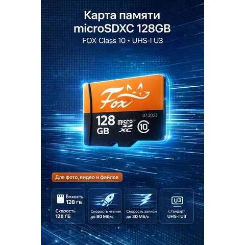 MicroSDXC FOX 128ГБ — это надежная и функциональная карта памяти, которая обеспечит надежность и безопасность эксплуатации устройства в составе различных устройств. Классификация по скорости записи Class 10 и класс скорости UHS-I U3 делают устройство подходящим для использования в различных условиях и сферах деятельности.