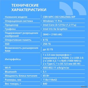 CBR MiniPC-DT001 (Intel i3-1215U /8Gb DDR4/256Gb SSD PCIe / W11Pro / 2 х USB 2.0, 2 х HDMI, 2 х USB