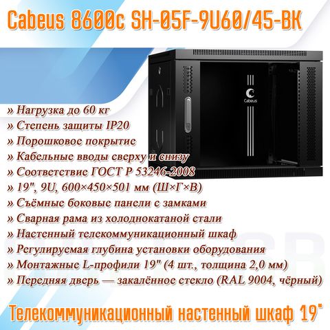SH-05F-9U60/45-BK — это настенный телекоммуникационный шкаф формата 19", предназначенный для установки оборудования связи и компьютерных сетей. Устройство оснащено передней дверцей из закалённого стекла с металлической рамой, что обеспечивает возможность визуального контроля состояния оборудования и защиту от несанкционированного доступа. Шкаф оборудован съемными боковыми панелями, что обеспечивает удобный доступ к установленному оборудованию и повышает надежность и безопасность эксплуатации устройства в условиях интенсивного использования. Несущая конструкция шкафа представляет собой сварную раму, что обеспечивает возможность выдерживания нагрузки до 60 кг и повышает надежность и безопасность эксплуатации устройства в условиях интенсивного использования. Шкаф оснащен перфорацией для естественной вентиляции, что обеспечивает возможность отвода тепла и повышения надежности и безопасности эксплуатации устройства в условиях интенсивного использования. Устройство оснащено монтажными профилями с юнитовой (U) разметкой, что обеспечивает возможность установки различного оборудования и повышает надежность и безопасность эксплуатации устройства в условиях интенсивного использования. Шкаф соответствует требованиям ГОСТ Р 53246-2008, что обеспечивает соответствие устройства российским стандартам и повышает надежность и безопасность эксплуатации устройства в условиях интенсивного использования.