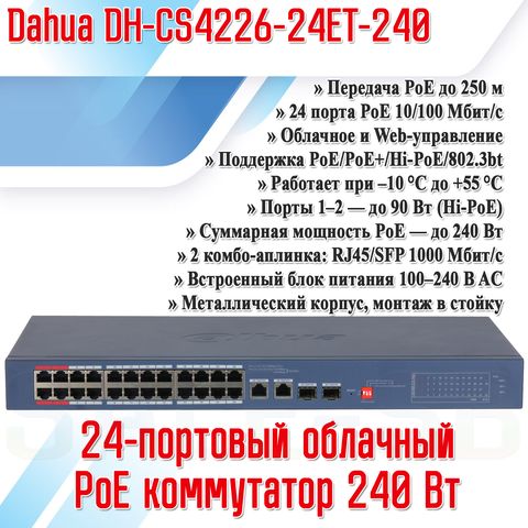 Dahua DH-CS4226-24ET-240 (L2) — это выбор тех, кто строит масштабируемую, надёжную и современную систему видеонаблюдения с возможностью удалённого управления, высокой энергоэффективностью и поддержкой самых мощных камер.