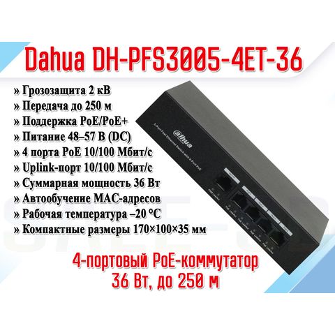 Dahua DH-PFS3005-4ET-36 — это готовое решение для быстрого и надёжного развертывания IP-видеонаблюдения. Его встроенное PoE, грозозащита, режим удлинения и простота установки делают его идеальным выбором для малых и средних объектов.
