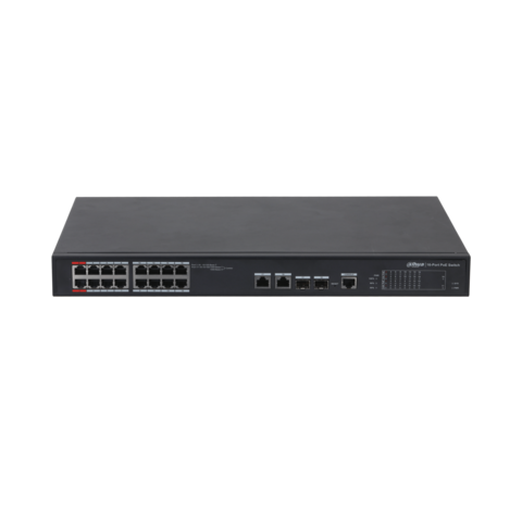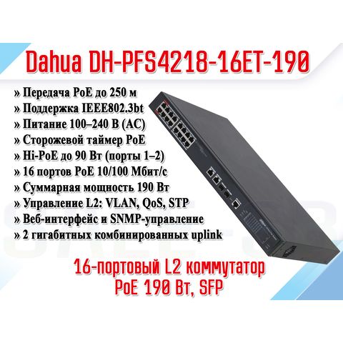 Dahua DH-PFS4218-16ET-190 — 16-портовый управляемый L2 коммутатор с PoE, Hi-PoE до 90 Вт, 2 комбинированных гигабитных uplink, веб-интерфейс, PoE watchdog, питание 100–240 В AC