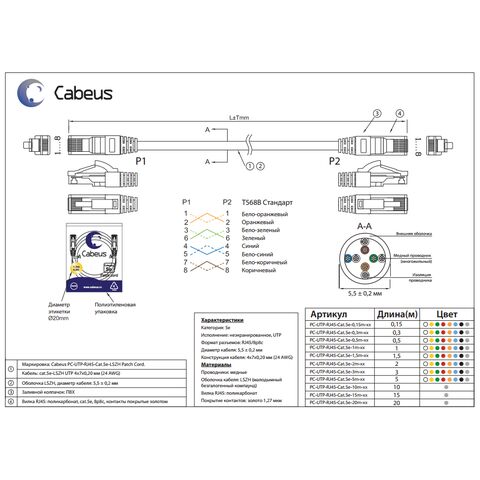 | Схема разводки кабеля: | С обеих сторон по стандарту Т568В |