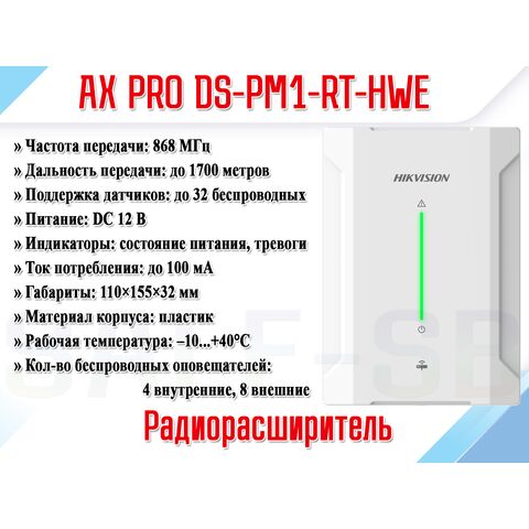 Радиорасширитель AX PRO DS-PM1-RT-HWE предназначен для расширения функциональных возможностей систем безопасности, созданных на базе панелей DS-PHA48/64. Устройство позволяет добавлять беспроводные датчики и оповещатели, используя беспроводную связь на частоте 868 МГц, что обеспечивает дальность передачи данных до 1700 метров.
