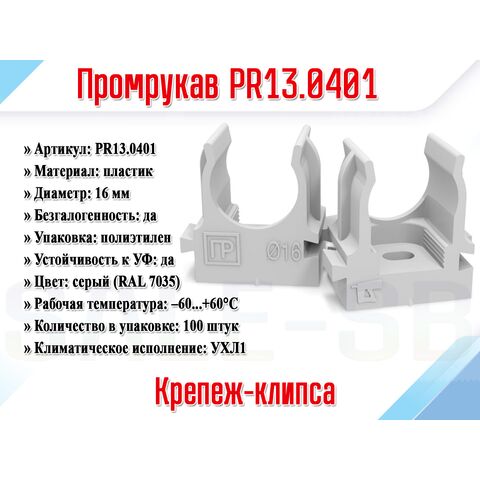 Крепеж-клипса Промрукав PR13.0401 предназначена для надежного и быстрого монтажа трубопроводов диаметром 16 мм. Изготовленная из атмосферостойкого пластика, клипса устойчива к ультрафиолетовому излучению и обладает свойствами негорючести (класс ПВ-0), что позволяет использовать её на открытом воздухе в различных климатических условиях.