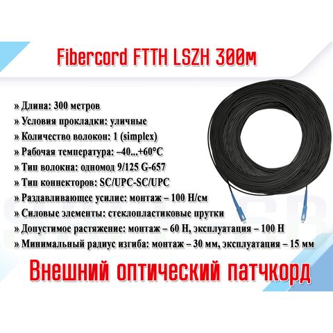 Таким образом, Fibercord FTTH LSZH G-657A1-SC/UPC-SC/UPC-SM-300м — это надежное и функциональное решение для организации сетей передачи данных, сочетающее в себе высокое качество, устойчивость к внешним воздействиям и простоту монтажа.