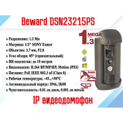 IP видеодомофон Beward DSN23215PS предназначен для организации систем контроля доступа и видеонаблюдения. Устройство оснащено 1,3-мегапиксельной камерой с матрицей Sony Exmor, обеспечивающей высокое качество изображения днем и ночью. Камера оснащена объективом с фиксированным фокусным расстоянием 3,7 мм и углом обзора 85 градусов по горизонтали, что позволяет охватить большую площадь.