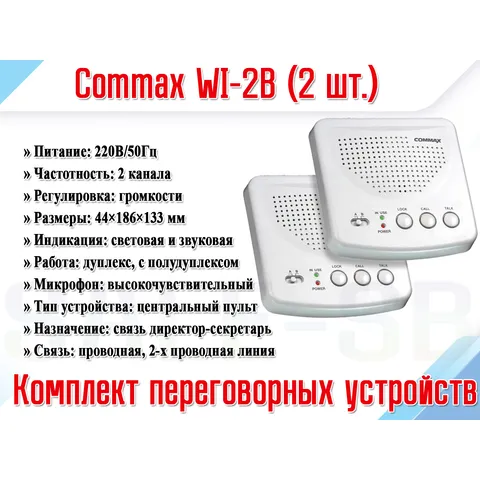 Комплект переговорных устройств Commax WI-2B предназначен для организации двусторонней связи между директором и секретарем. Устройство оснащено высокочувствительным микрофоном и регулятором громкости, что позволяет настроить оптимальный уровень звука в зависимости от условий эксплуатации.