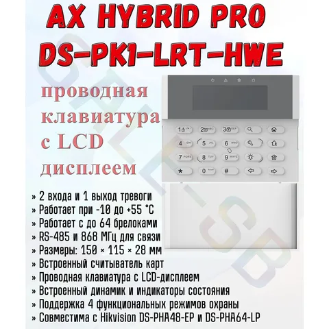 Проводная клавиатура AX PRO DS-PK1-LRT-HWE – это многофункциональное устройство для управления охранной системой Hikvision. Обладая LCD-дисплеем размером 80 × 25 мм, поддержкой беспроводных брелоков (до 64 штук), считывателем карт и возможностью отображения состояния системы в реальном времени, она обеспечивает высокий уровень функциональности и удобства для пользователей.