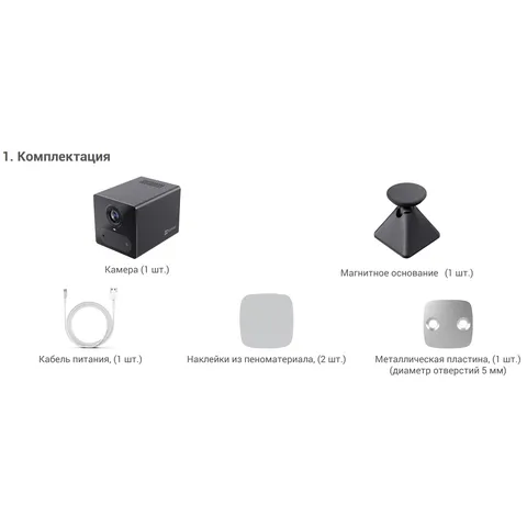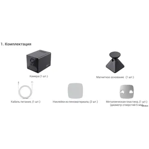 | Комплектация: | Камера, магнитная подставка, кабель питания, две липучки из вспененного материала, металлическая пластина (диаметром отверстия 5 мм), комплект шурупов, инструкции по сертификации × 2, быстрое руководство |