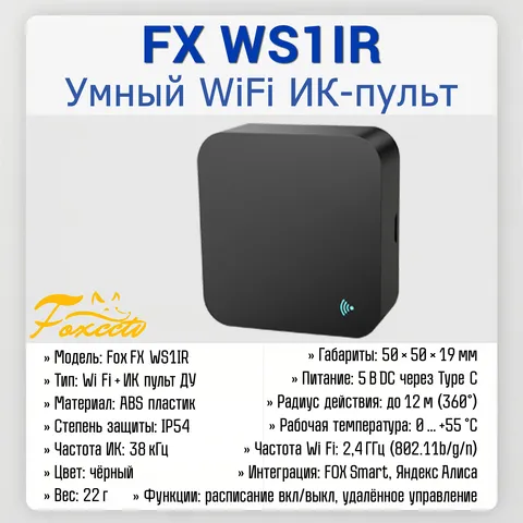 Wi‑Fi ИК‑пульт Fox FX‑WS1IR позволяет дистанционно управлять бытовой техникой (кондиционерами, вентиляторами, ТВ, DVD‑плеерами, ТВ‑приставками и др.) через приложение FOX Smart.