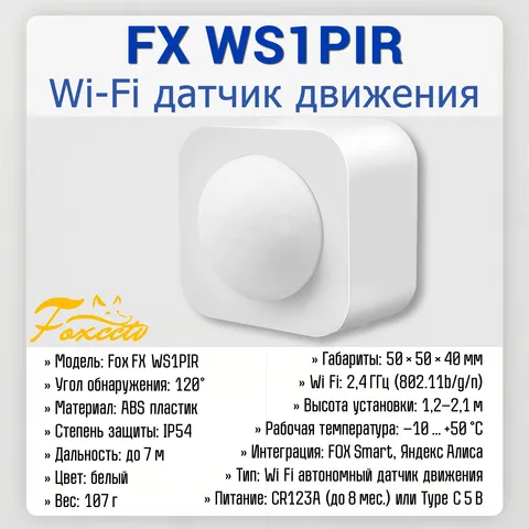 - Для работы требуется подключение к Wi‑Fi сети (2,4 ГГц); - Батарея CR123А в комплект не входит; - Приложение FOX Smart необходимо для настройки и управления; - Поддержка Яндекс Алисы позволяет управлять датчиком голосом; - Степень защиты IP54 обеспечивает устойчивость к пыли и брызгам воды; - Рекомендуется установка на высоте 1,2–2,1 м для оптимальной работы датчика; - При использовании батареи датчик полностью автономный, при питании от USB требуется постоянное подключение. |