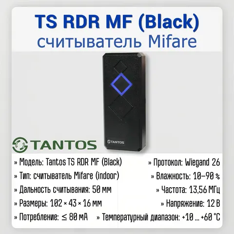 Считыватель Tantos TS‑RDR‑MF Black (indoor) предназначен для работы в системах контроля доступа. Устройство считывает идентификаторы формата Mifare (в режиме чтения UID) и передаёт данные по протоколу Wiegand‑26. Подходит для установки внутри помещений.