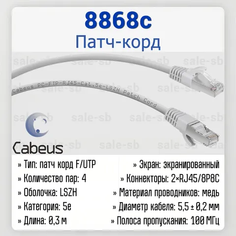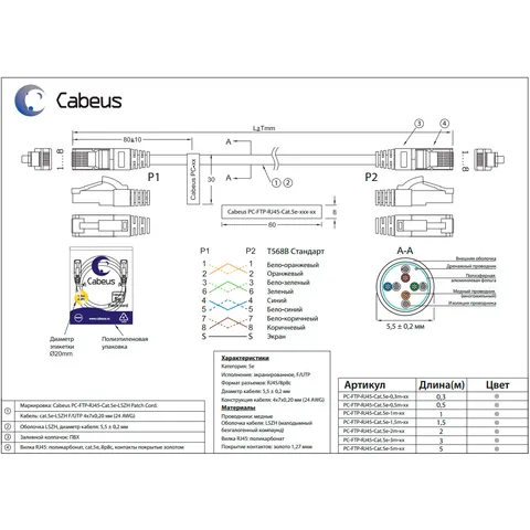 Технические характеристики патч‑корда Cabeus PC‑FTP‑RJ45‑Cat.5e‑0.3m‑LSZH (8868c)