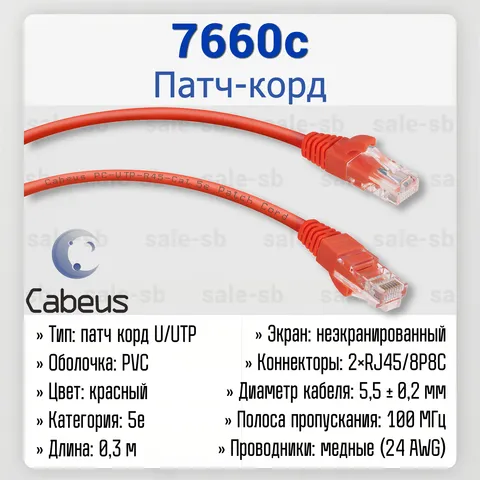 Патч‑корд Cabeus Cat 5e 0.3 м U/UTP PVC — красный, неэкранированный