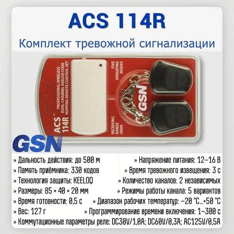 GSN ACS‑114R подойдёт для квартир, домов, офисов и других объектов, где требуется защита и удобное дистанционное управление оборудованием по двум каналам с расширенными возможностями программирования режимов работы.