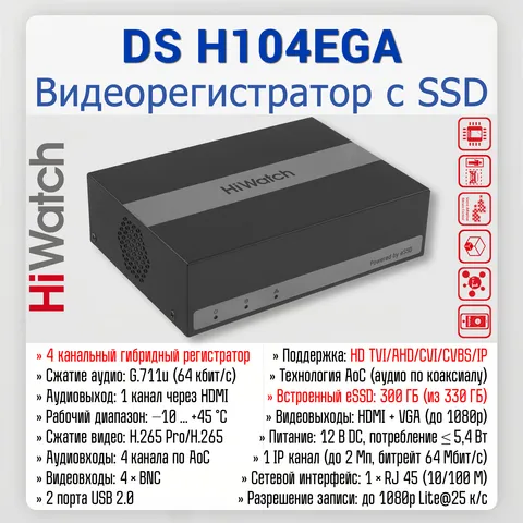HiWatch DS‑H104EGA — сбалансированное решение для модернизации аналоговых систем или построения нового видеонаблюдения с гибридной инфраструктурой. Благодаря eSSD, технологии AoC и ИИ‑аналитике регистратор обеспечивает: