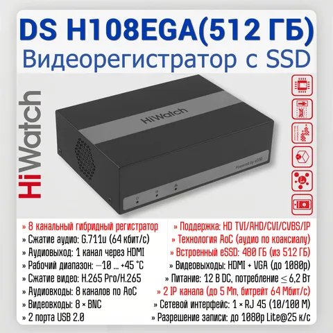 | Технические характеристики видеорегистратора HiWatch DS‑H108EGA (512 GB) | |