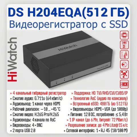 | Технические характеристики видеорегистратора HiWatch DS‑H204EQA (512 GB) | |