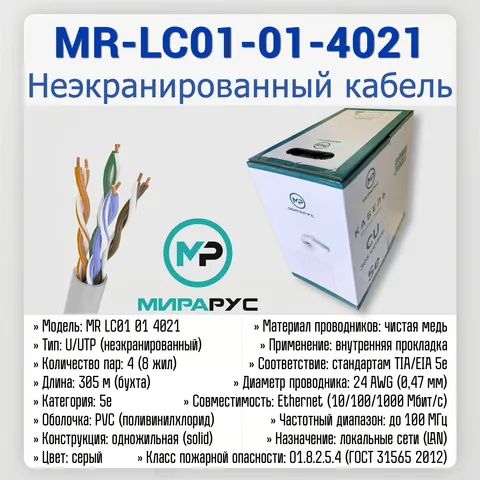 MR‑LC01‑01‑4021 — оптимальное решение для построения надёжных внутренних сетей Ethernet на объектах с протяжёнными трассами прокладки. Сочетание медной проводящей жилы, качественной ПВХ‑оболочки и соответствия категории 5e обеспечивает: