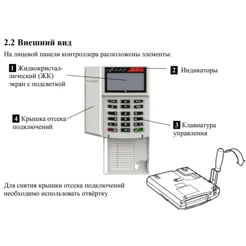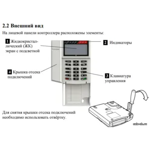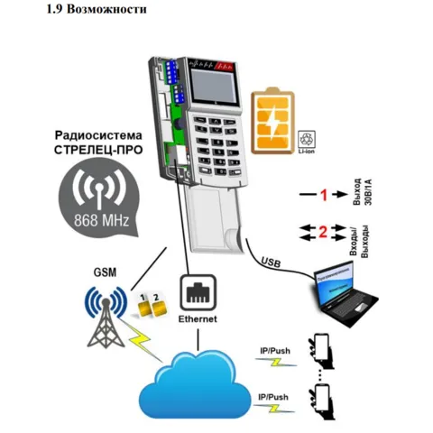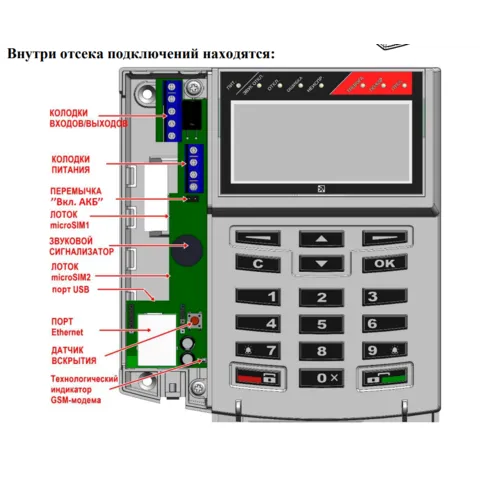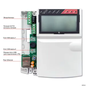 - жидкокристаллический дисплей; - кнопочная клавиатура; - встроенный GSM‑модем (2 SIM‑карты); - встроенный аккумулятор |