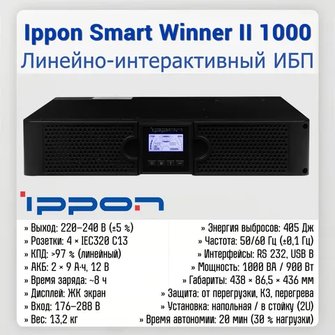 Ippon Smart Winner II 1000 — надёжное решение для защиты критически важного оборудования. Его ключевые преимущества: