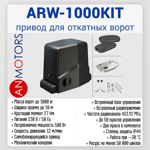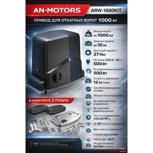 AN-Motors ARW-1000KIT — электропривод для автоматизации откатных ворот массой до 1000 кг и шириной проёма до 10 метров. Комплект предназначен для частных, коммерческих и промышленных объектов. Работает от сети 230 В и оснащён встроенным блоком управления и радиоприёмником.