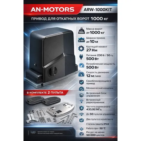 AN-Motors ARW-1000KIT — надёжная автоматика для откатных ворот, адаптированная под климат России и интенсивную эксплуатацию. Подходит для жилых, коммерческих и промышленных объектов.
