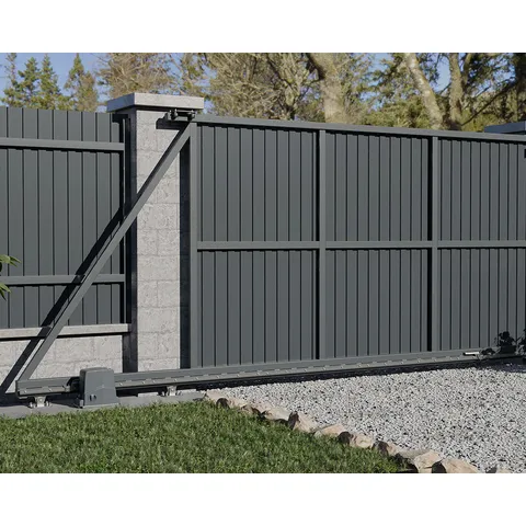 Привод является самоблокирующимся — при закрытых воротах полотно невозможно сдвинуть вручную без разблокировки, что повышает уровень безопасности территории.