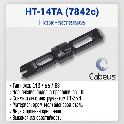 Нож-вставка Cabeus HT-14TA предназначен для заделки проводников в телекоммуникационные модули с контактами типа 66 и 110/88. Используется совместно с ударным инструментом Cabeus HT-364.