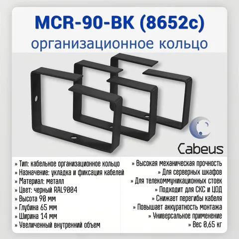 Cabeus MCR-90-BK — металлическое организационное кольцо увеличенного размера, предназначенное для аккуратной укладки и направления кабелей внутри серверных шкафов и телекоммуникационных стоек. Обеспечивает порядок кабельных трасс и снижает механическую нагрузку на проводники.