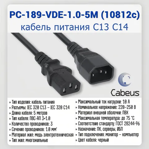 Cabeus PC-189-VDE-1.0-5M — кабель питания длиной 5 метров, предназначенный для подключения компьютерного, серверного и телекоммуникационного оборудования к сети переменного тока.