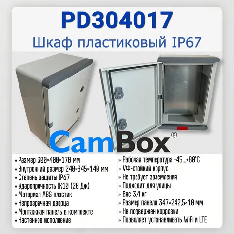 CamBox PD304017 — надежный уличный пластиковый шкаф с высокой степенью защиты IP67 и ударопрочностью IK10. Подходит для размещения оборудования видеонаблюдения и электромонтажа в сложных климатических условиях. УФ-стойкий, коррозионно-устойчивый и не требующий заземления корпус делает его универсальным решением для наружной установки.