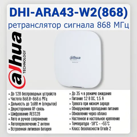 Dahua DHI-ARA43-W2(868) — надежное решение для увеличения радиуса действия беспроводной охранной системы. Поддержка до 128 устройств, высокая дальность связи, двухсторонняя передача данных и шифрование AES128 обеспечивают стабильную и безопасную работу на объектах различной сложности.