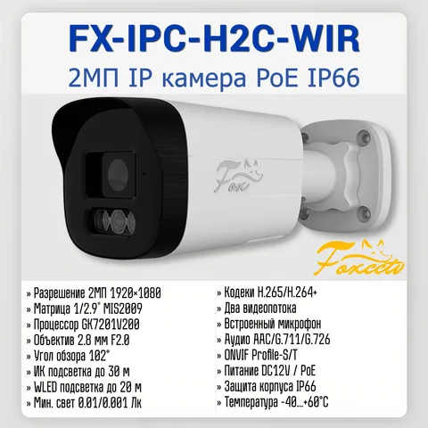 Fox FX-IPC-H2C-WIR — уличная IP-камера видеонаблюдения с разрешением 2 МП (1920×1080), встроенным микрофоном и гибридной подсветкой: ИК до 30 м и тёплый белый WLED до 20 м. Позволяет вести круглосуточное наблюдение в цветном или чёрно-белом режиме.