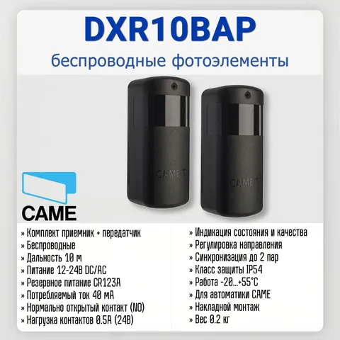 CAME DXR10BAP — это комплект беспроводных фотоэлементов (приемник и передатчик) для систем безопасности автоматических ворот и шлагбаумов. Устройства предназначены для обнаружения препятствий в зоне проезда и предотвращения закрытия ворот при наличии человека, автомобиля или другого объекта. Фотоэлементы работают от внешнего источника питания 12-24В или от батарейки CR123A, что обеспечивает гибкость установки. Благодаря беспроводной связи, монтаж не требует прокладки дополнительных кабелей между приемником и передатчиком. Дальность действия составляет до 10 метров. Фотоэлементы оснащены индикацией состояния выходных контактов и качества направленности, что упрощает настройку. Устройства совместимы с автоматикой CAME для откатных, секционных, распашных, подъемно-поворотных ворот и шлагбаумов.