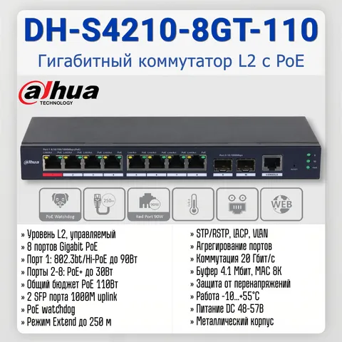 Dahua DH-S4210-8GT-110 — это мощный управляемый гигабитный коммутатор уровня L2 с поддержкой PoE, предназначенный для построения профессиональных сетей видеонаблюдения и систем безопасности. Коммутатор оснащен 8 портами RJ45 с поддержкой PoE: первый порт поддерживает стандарт IEEE 802.3bt (Hi-PoE) с выходной мощностью до 90 Вт, а порты 2-8 поддерживают PoE+ (до 30 Вт). Общий бюджет PoE составляет 110 Вт. Два порта SFP обеспечивают гигабитное подключение по оптике для uplink. Устройство поддерживает расширенные функции управления: PoE watchdog для автоматического перезапуска зависших устройств, режим увеличенной дальности PoE до 250 м, протоколы STP/RSTP, агрегирование портов LACP, VLAN, QoS и управление через веб-интерфейс/SNMP. Металлический корпус, защита от перенапряжений и широкий температурный диапазон гарантируют надежную работу в различных условиях.