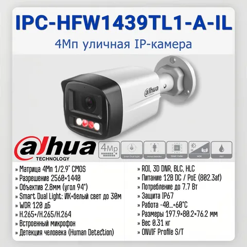 Dahua DH-IPC-HFW1439TL1-A-IL — это современная 4-мегапиксельная уличная цилиндрическая камера, сочетающая доступную цену и передовые технологии. Ключевой особенностью является интеллектуальная гибридная подсветка Smart Dual Light, которая обеспечивает цветное видео ночью только при обнаружении человека, экономя энергию и снижая световое загрязнение. Встроенная детекция человека и WDR 120 дБ гарантируют высокую точность и качество изображения в любых условиях. Эффективное сжатие Smart H.265+ и поддержка PoE делают камеру идеальным выбором для малого и среднего бизнеса, частных домовладений и объектов, где требуется надежное и экономичное решение для видеонаблюдения.