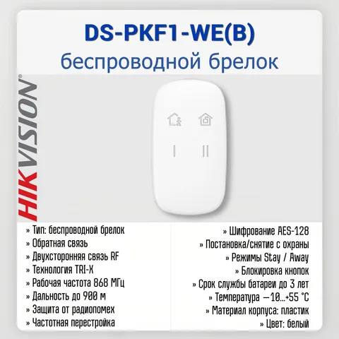 AX PRO DS-PKF1-WE(B) — беспроводной брелок управления охранной системой AX PRO с обратной связью и двухсторонней радиосвязью по технологии TRI-X. Предназначен для дистанционной постановки и снятия системы с охраны.