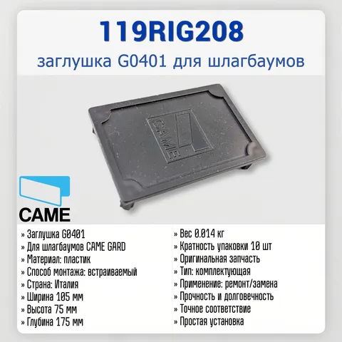 CAME 119RIG208 — это оригинальная пластиковая заглушка G0401, предназначенная для использования в качестве запасной части в шлагбаумах серии GARD производства итальянского бренда CAME. Заглушка используется для закрытия технологических отверстий или декоративных элементов корпуса шлагбаума. Изделие выполнено из качественного пластика, устойчивого к внешним воздействиям, и точно соответствует заводским спецификациям. Заглушка поставляется в индивидуальной упаковке, кратность отгрузки — 10 штук.