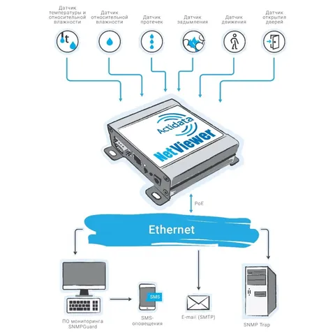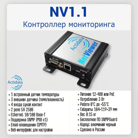 Actidata NV1.1 — это экономичный и функциональный контроллер мониторинга, предназначенный для удаленного контроля температуры, влажности и других параметров в серверных, складских, производственных и жилых помещениях. Устройство оснащено встроенным датчиком температуры и позволяет подключать до трех внешних датчиков температуры и/или относительной влажности. Четыре входа "сухой контакт" дают возможность подключать датчики протечек, открытия дверей, движения, задымления и другие. Два встроенных реле (5А, 250В) могут использоваться для управления сигнализацией, вентиляцией или другим оборудованием при срабатывании датчиков. Контроллер поддерживает мониторинг по SNMP, отправку оповещений по email, имеет удобный веб-интерфейс и поставляется с бесплатной лицензией ПО SNMPGuard. Питание возможно как от источника 12-48В, так и по PoE.