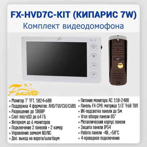 Fox FX-HVD7C-KIT (КИПАРИС 7W) — это функциональный и надежный комплект видеодомофона, который станет отличным решением для вашего дома или офиса. 7-дюймовый монитор с высоким разрешением, поддержка всех современных аналоговых форматов (AHD/TVI/CVI), возможность записи на SD-карту и интерком до 6 мониторов делают эту систему универсальной. Уличная вызывная панель с металлическим корпусом, ИК-подсветкой и защитой IP54 прослужит долгие годы в любых погодных условиях, даже при -40°C. Возможность управления замком и воротами, подключения дополнительных камер и совместимость с подъездными домофонами расширяют сферы применения комплекта.