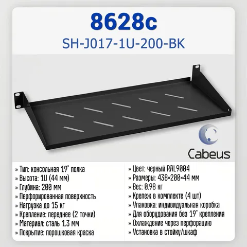 Cabeus 8628c — это консольная (переднего крепления) перфорированная полка высотой 1U, предназначенная для установки в 19-дюймовые телекоммуникационные шкафы и стойки. Полка используется для размещения оборудования, которое не имеет стандартного 19-дюймового крепления ("ушей"), например, небольших маршрутизаторов, модемов, медиаконвертеров, сетевых хранилищ (NAS) или источников бесперебойного питания (ИБП) малого форм-фактора. Глубина полки составляет 200 мм, что оптимально для компактных устройств. Перфорация на поверхности полки обеспечивает эффективное охлаждение установленного оборудования. Полка изготовлена из холоднокатаной стали толщиной 1.3 мм и покрыта ударопрочной порошковой краской черного цвета (RAL9004). В комплект входит необходимый крепеж для монтажа.
