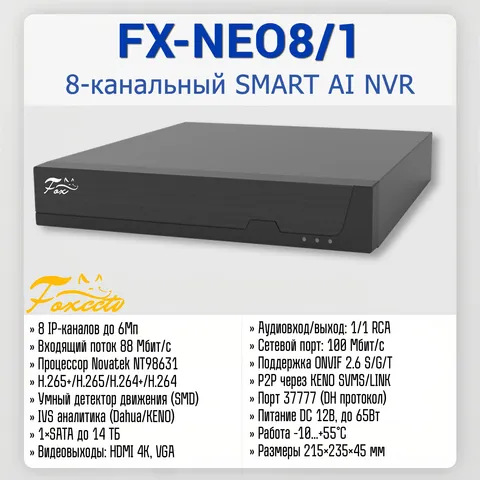 Fox FX-NEO8/1 — это высокопроизводительный 8-канальный IP-видеорегистратор (NVR) с поддержкой SMART AI-функций и современных кодеков сжатия H.265+/H.265/H.264+. Устройство предназначено для построения систем видеонаблюдения среднего масштаба и обеспечивает запись до 8 камер с разрешением до 6 мегапикселей (3288×1850) при суммарном потоке 88 Мбит/с. Регистратор оснащен процессором Novatek NT98631, поддерживает умный детектор движения (SMD) и IVS-аналитику от IP-камер Dahua и KENO. Видеовыход HDMI позволяет выводить изображение в разрешении 4K. Устройство имеет один отсек для HDD SATA объемом до 14 ТБ, поддерживает ONVIF 2.6 (Profile S/G/T) и обеспечивает удобный P2P-доступ через приложения KENO SVMS и KENO LINK. Компактный металлический корпус и простота установки делают эту модель отличным выбором для офисов, магазинов и других объектов.