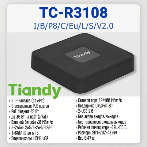 TIANDY AK TC-R3108 — это 8-канальный IP-видеорегистратор из серии Analog Killer, предназначенный для построения компактных и эффективных систем видеонаблюдения. Устройство оснащено встроенным 8-портовым PoE-коммутатором с общим бюджетом 45 Вт (до 30 Вт на порт), что позволяет подключать и питать камеры напрямую, без дополнительного оборудования. Регистратор поддерживает современные кодеки S+265 и H.265, обеспечивая высокое качество записи при минимальном占用 дискового пространства. Поддержка разрешения до 6 Мп и входной битрейт 60 Мбит/с гарантируют детализированное изображение. Устройство имеет один отсек для SATA HDD до 6 ТБ, видеовыходы HDMI и VGA, а также поддерживает подключение сторонних камер по ONVIF и RTSP. Компактный металлический корпус и простота установки делают эту модель идеальным решением для небольших и средних объектов.